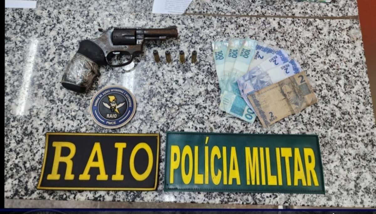Uma equipe do Comando de Policiamento de Rondas de Ações Intensivas e Ostensivas (CPRaio) da Polícia Militar do Ceará (PMCE) prendeu um homem de 28 anos e apreendeu um revólver calibre .38 com quatro munições, além de R$ 310 em espécie, na noite desse domingo (26), na localidade de Mãe Cosma, zona rural de Itarema.