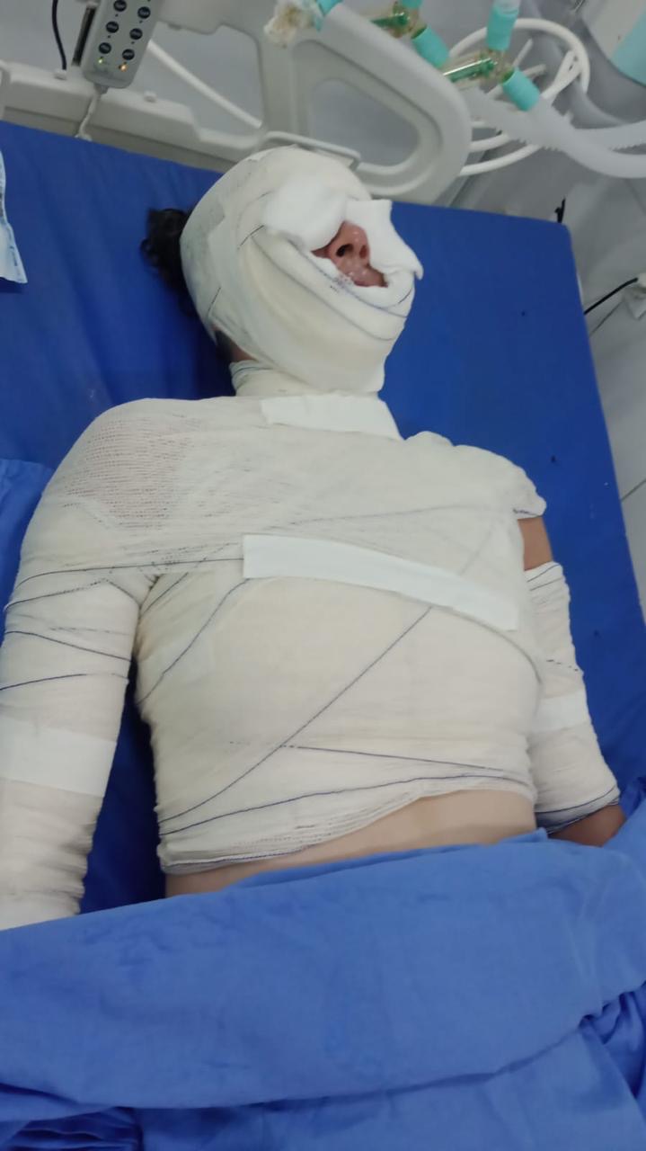 A explosão atingiu o rosto e o corpo da vítima, que ficou com o rosto completamente coberto por curativos. Seu estado de saúde era considerado grave.