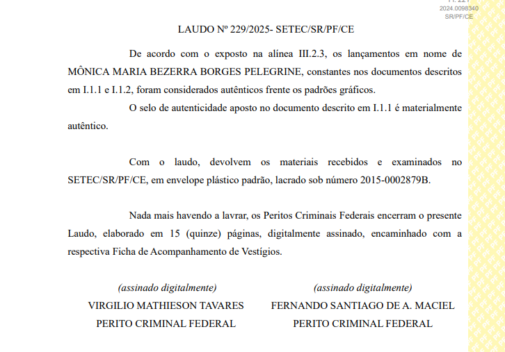 O laudo também descartou adulterações nos documentos, como rasuras ou montagens, e confirmou a autenticidade material do selo extrajudicial de reconhecimento de firma presente em um dos formulários. “De acordo com o exposto na alínea III.2.3, os lançamentos em nome de Mônica Maria Bezerra Borges Pelegrine, constantes nos documentos descritos em I.1.1 e I.1.2, foram considerados autênticos frente os padrões gráficos. O selo de autenticidade aposto no documento descrito em I.1.1 é materialmente autêntico.” Assinam dois peritos da Polícia federal.