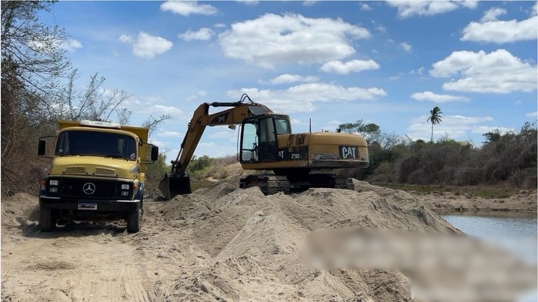 Durante a fiscalização, agentes encontraram dois caminhões e uma retroescavadeira em plena atividade. Quatro pessoas foram conduzidas para prestar esclarecimentos, e aproximadamente 13 metros cúbicos de areia retirados de forma irregular foram devolvidos ao leito do rio, como medida de reparação ambiental.