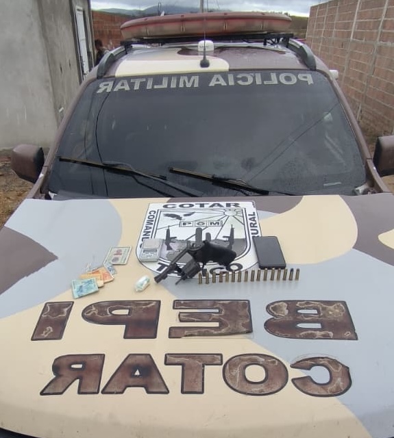 Durante as buscas, os policiais encontraram um revólver calibre .38, além de 16 munições. Também foram apreendidos uma balança de precisão, R$ 167 em espécie, três aparelhos celulares e embalagens plásticas utilizadas para fracionar drogas. Questionado sobre o material, o suspeito admitiu que já havia comercializado entorpecentes e que teria prestado contas à organização criminosa à qual estaria ligado.