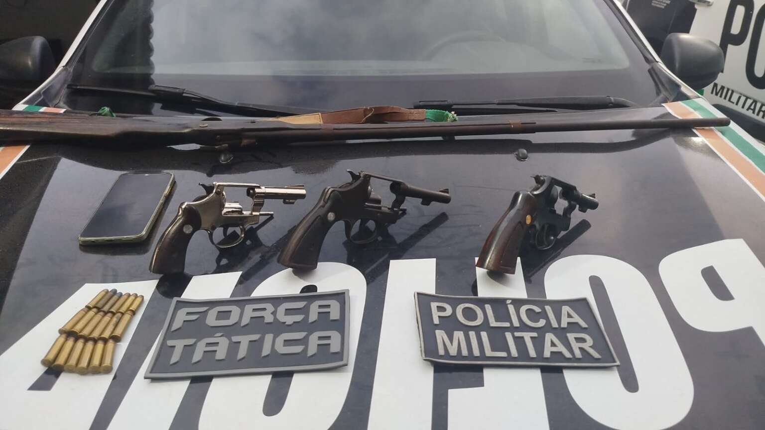 Ainda segundo a pasta, as equipes se dirigiram até o local indicado e realizaram uma varredura, localizando e apreendendo um adolescente em posse de um revólver .38 e prendendo um adulto em posse dos outros dois revólveres e da espingarda artesanal.