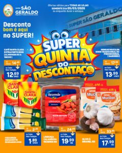 O Super São Geraldo realiza nesta quinta-feira, 05 de março, mais uma edição da já tradicional Super Quinta do Descontaço, com ofertas especiais válidas para todas as lojas da rede e condições exclusivas para clientes do Clube Mais Tradição.