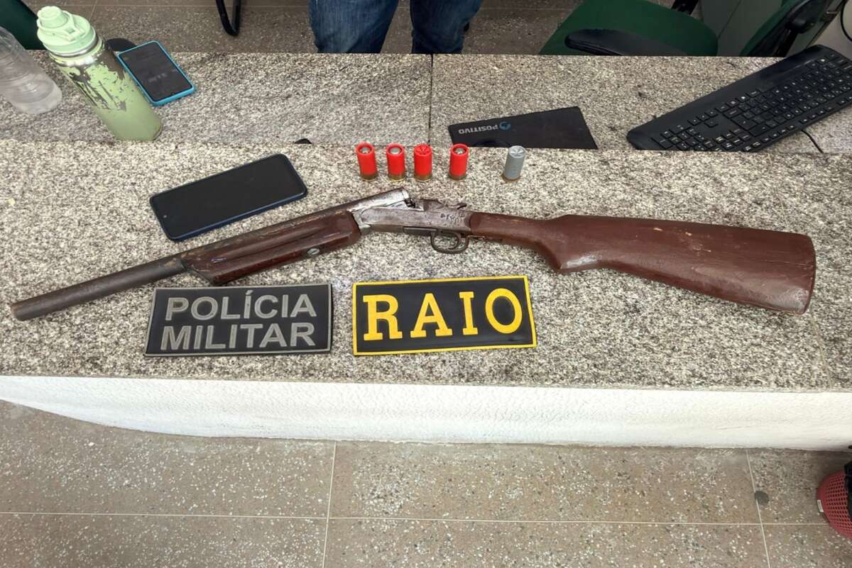 Com apoio do Destacamento de Choró, os policiais militares seguiram até a residência do suspeito, no distrito de Serrote Branco, em Quixadá. Após autorização de uma moradora, foi realizada busca domiciliar, sendo encontrada uma espingarda calibre .12 escondida embaixo de uma cama.